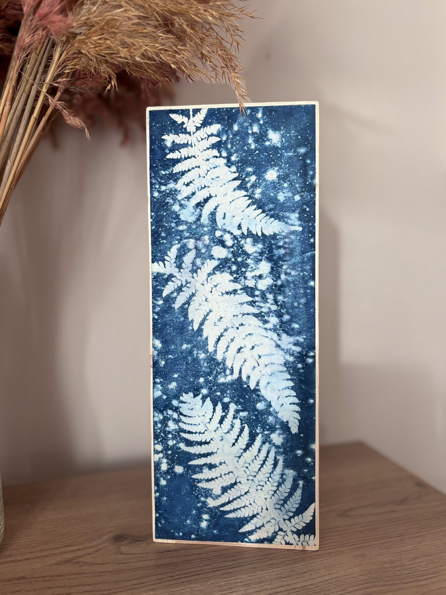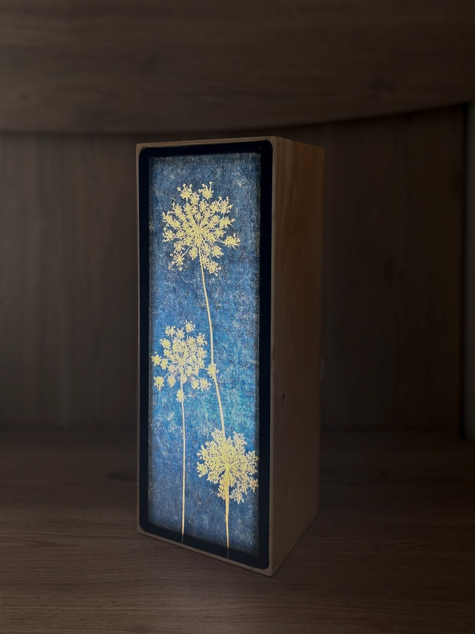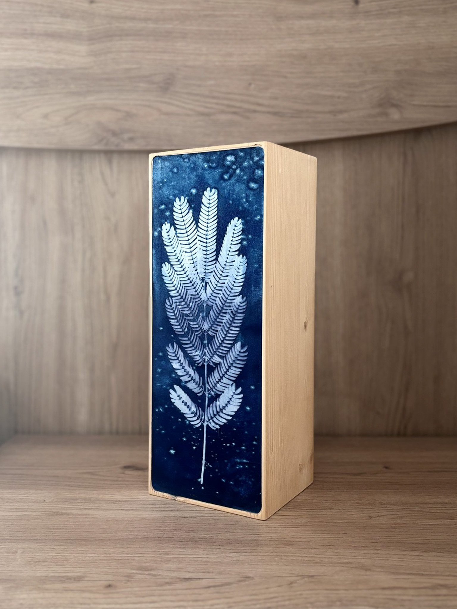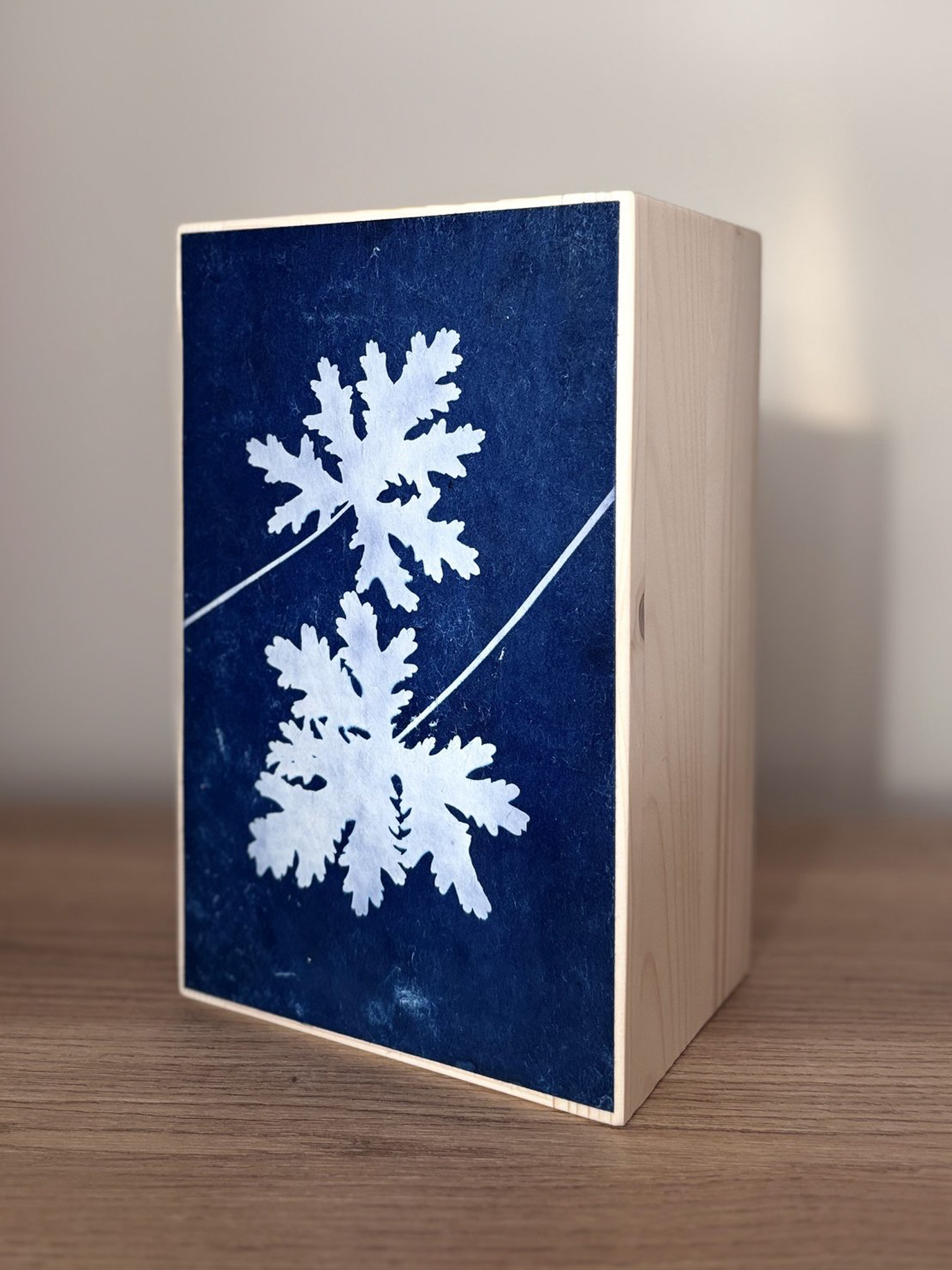 Realizo lámparas artesanas con cianotipia y cajas de luz hechas a mano en madera de abeto. Se pueden personalizar en cuanto a tamaño, formas y decoración.