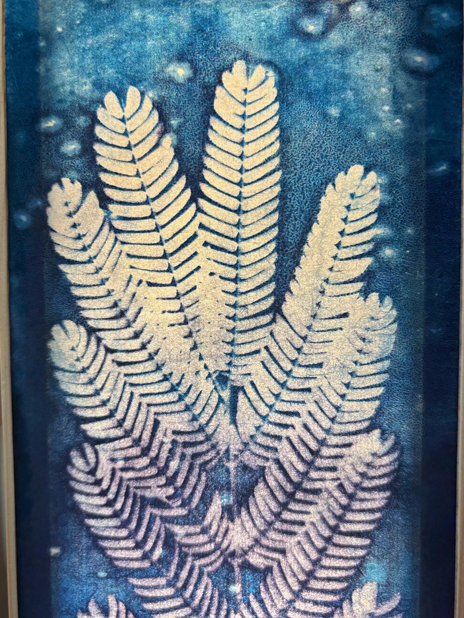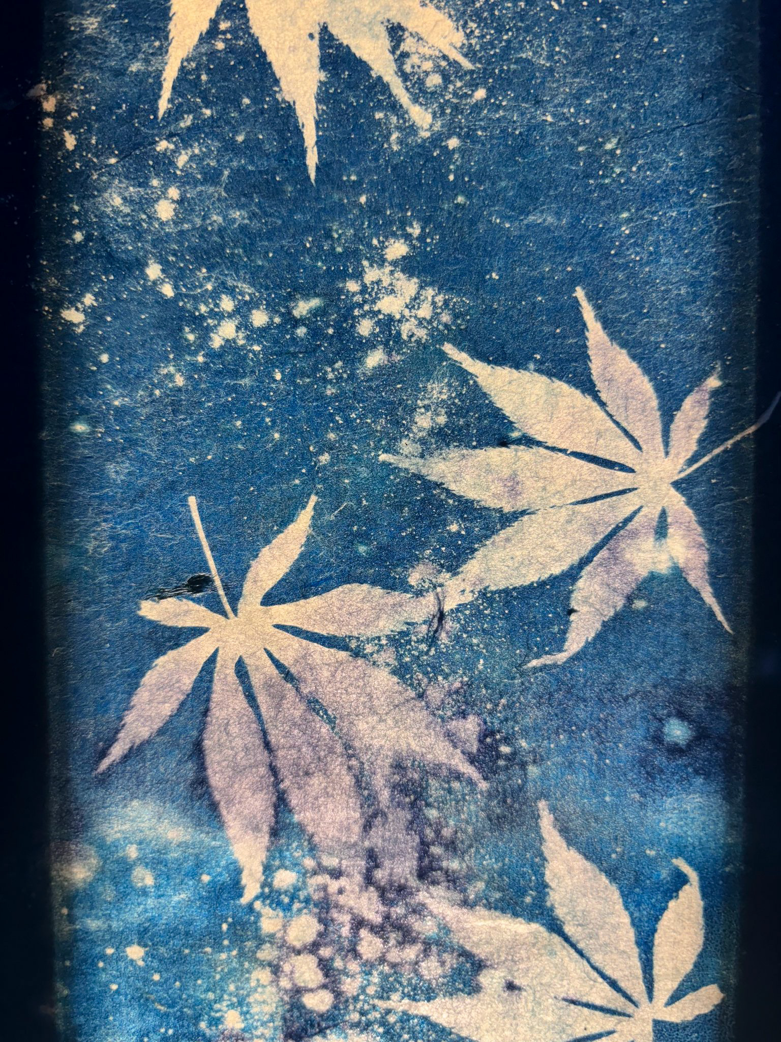 La parte externa se compone de una cianotipia realizada en un papel coreano de tan solo 80 grms. Se puede realizar tanto en varios motivos botánicos como paisajístico o de cualquier tipo de fotografía de la que se pueda realizar un negativo.