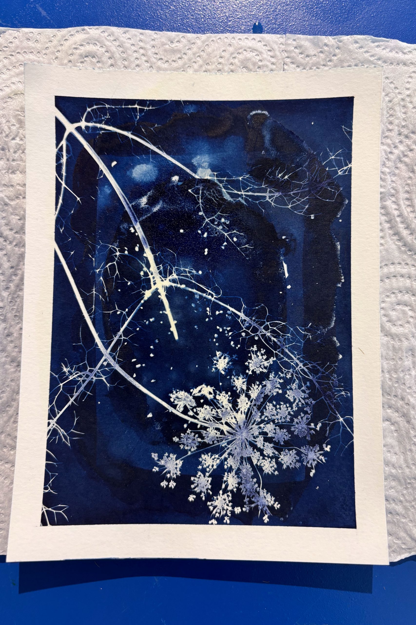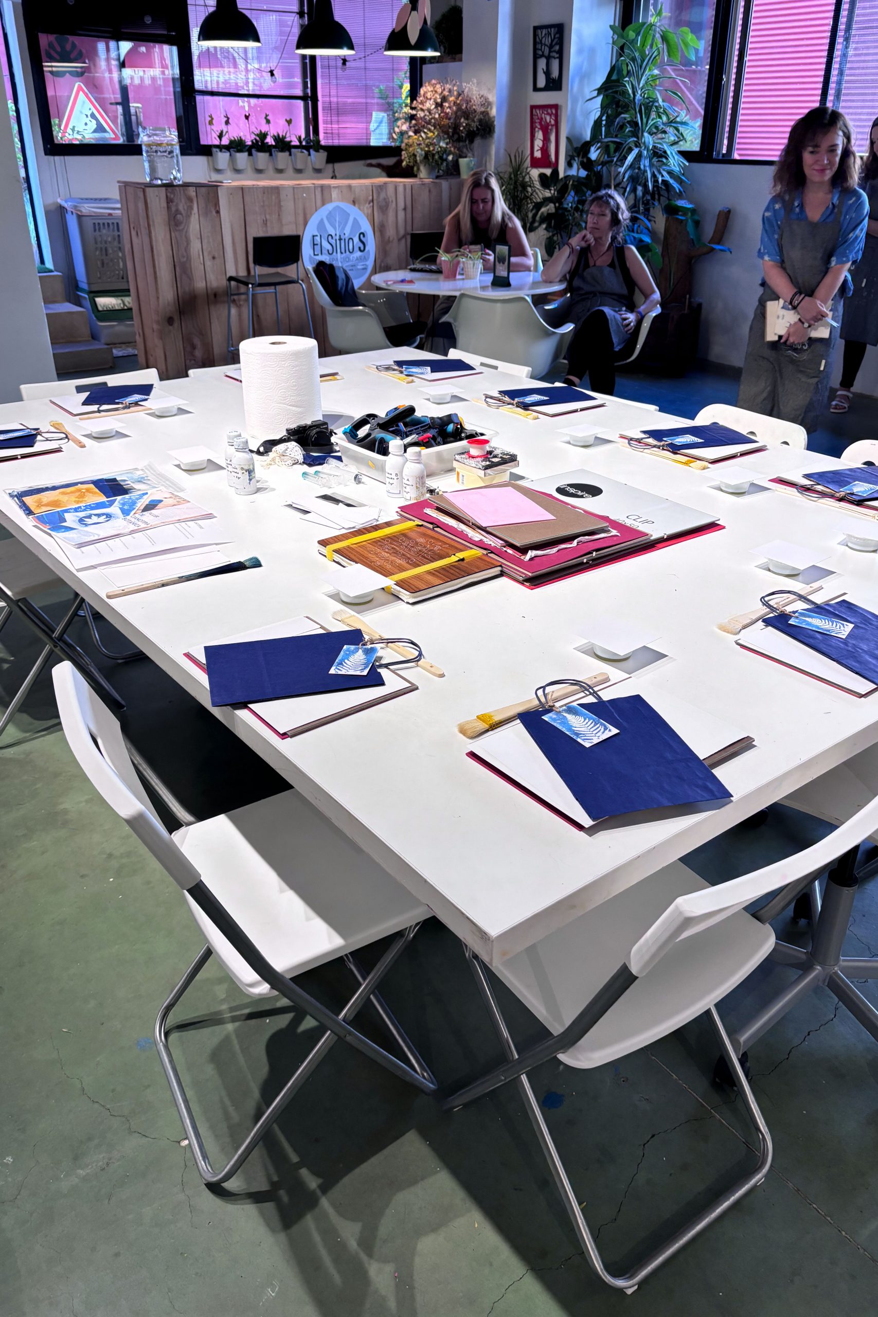 Una vez que se completa la exposición, los materiales se lavan cuidadosamente para detener la reacción química y revelar el resultado final. El emocionante momento de ver aparecer las imágenes en tonos azules profundos es sin duda un punto culminante del taller.