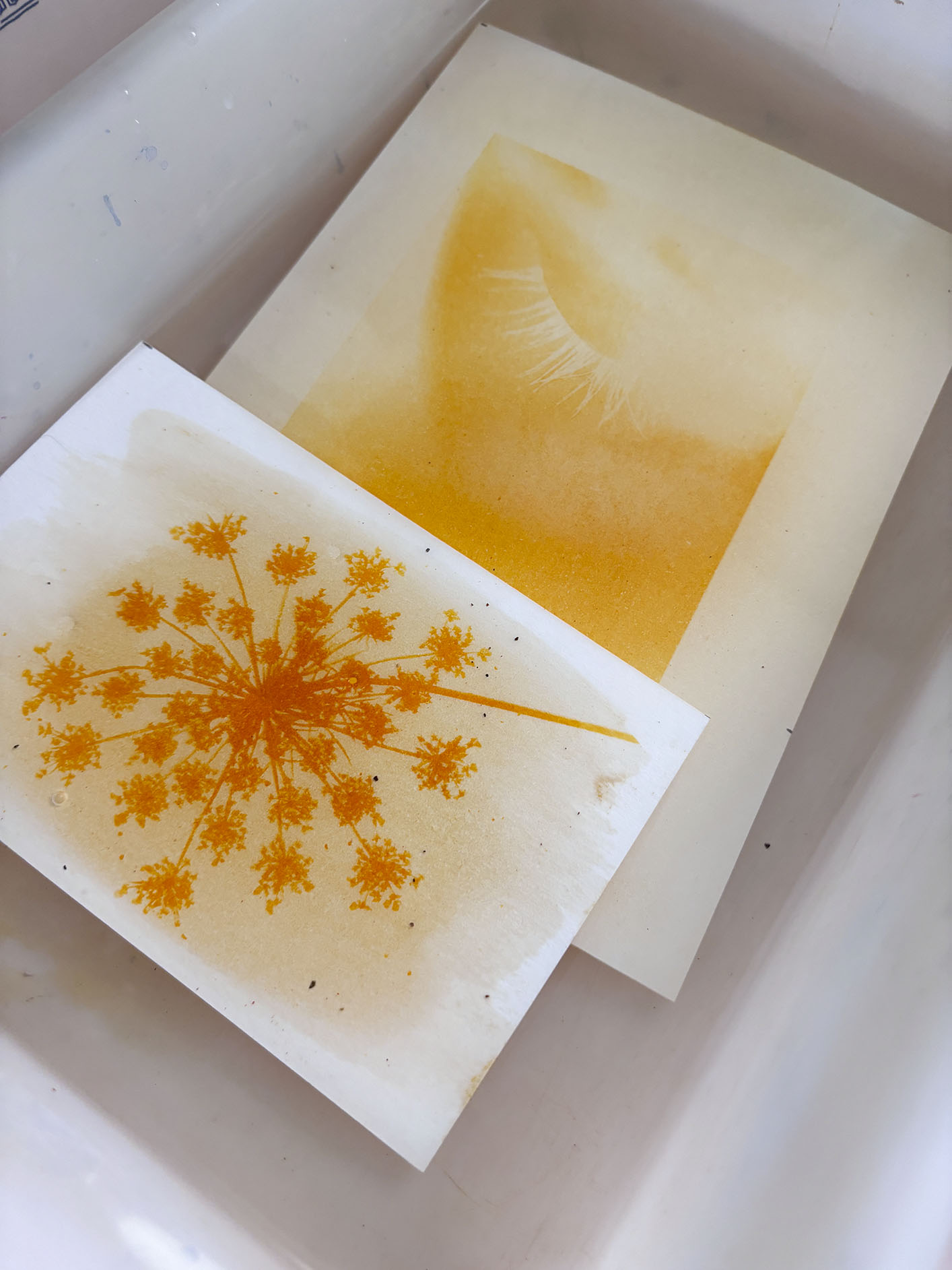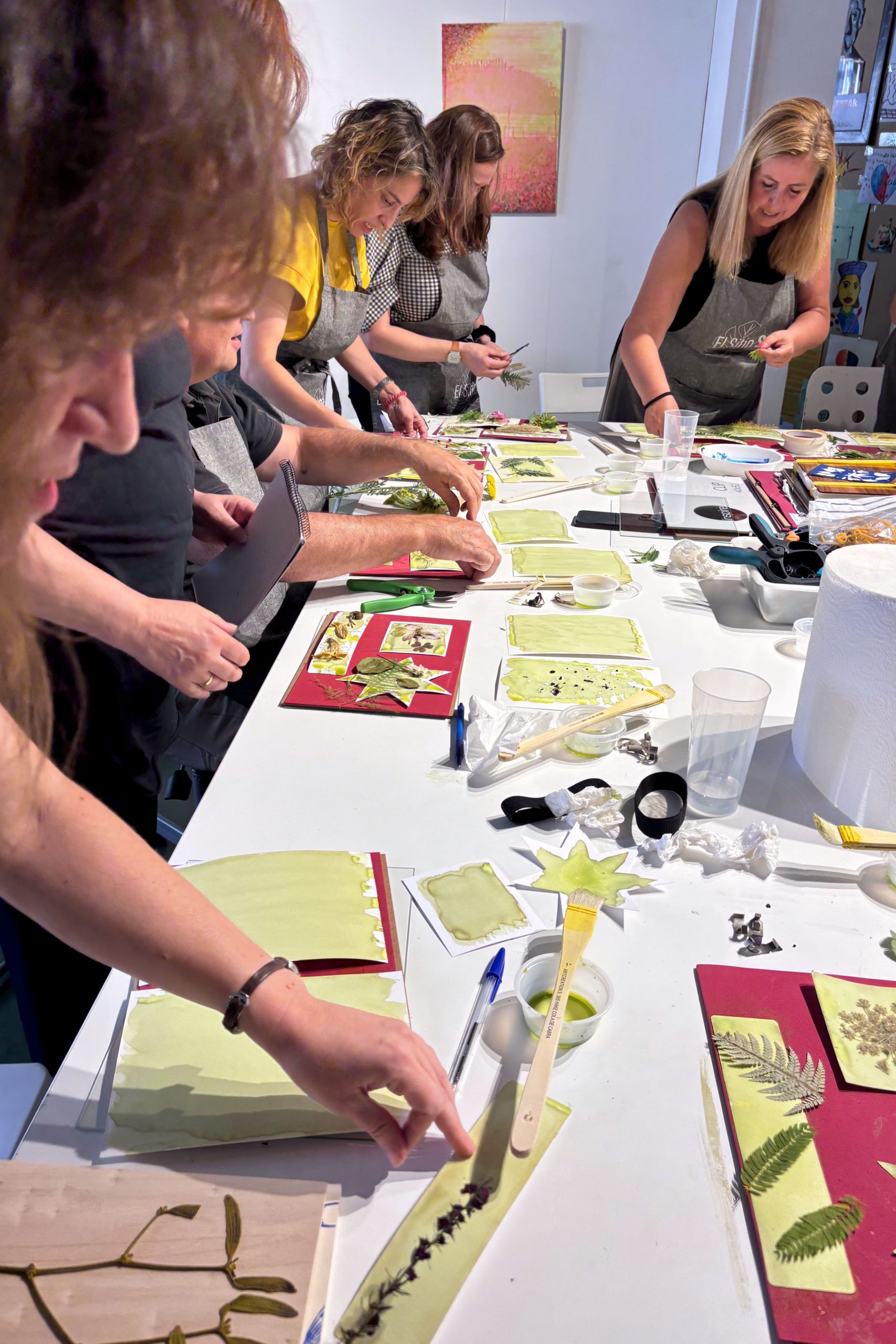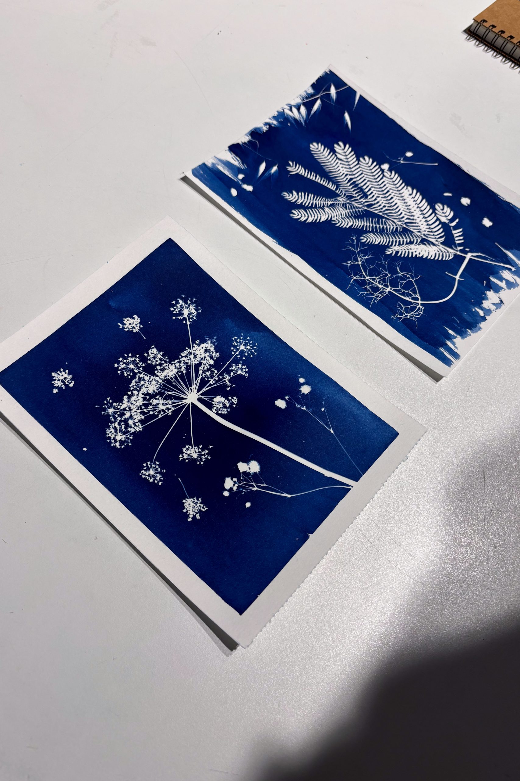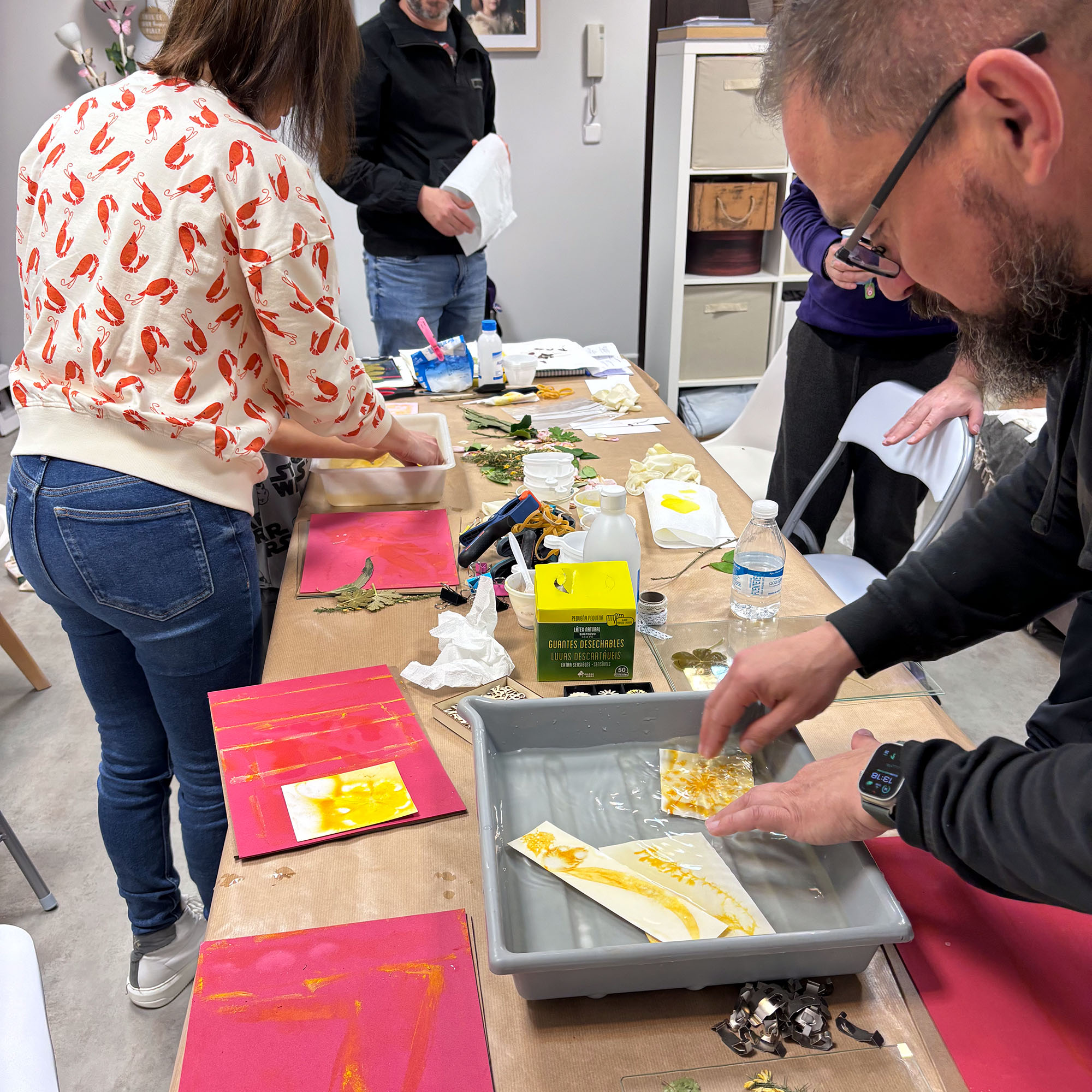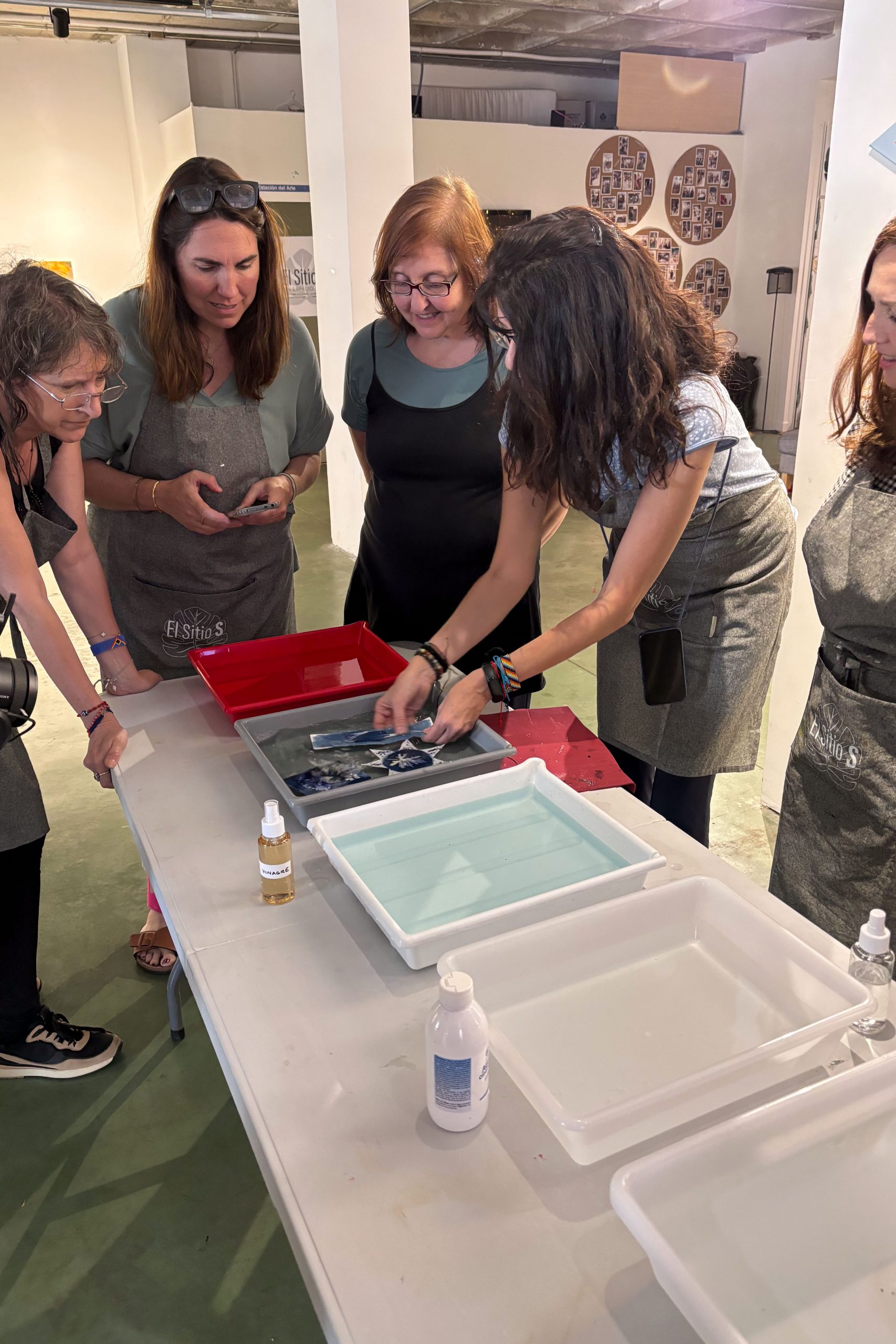 Una vez que se completa la exposición, los materiales se lavan cuidadosamente para detener la reacción química y revelar el resultado final. El emocionante momento de ver aparecer las imágenes en tonos azules profundos es sin duda un punto culminante del taller.