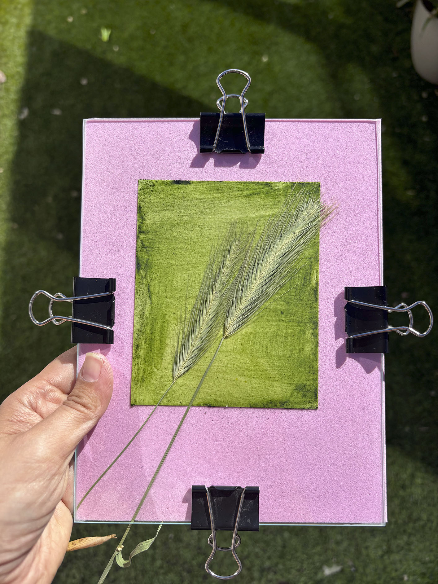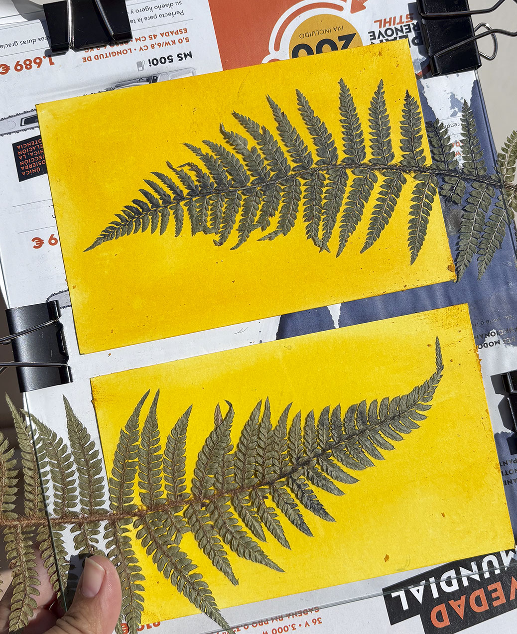 El proceso comienza al mezclar los productos químicos y aplicar la solución sobre el papel. Luego, se colocan los objetos y se exponen al sol.